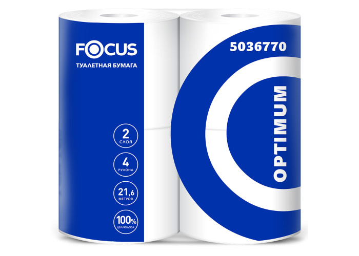 Двухслойная туалетная бумага Focus Optimum (Фокус Оптимум) в малых рулонах белоснежного цвета со втулкой и тиснением из 100% целлюлозы высокого качества, для санитарно-гигиенического назначения. Стандартная намотка. Бумага изготовлена с применением специальной технологии ViscoNip (запатентована производителем Hayat) - внешний слой листа мягкий, внутренний очень прочный, что придает изделию особую мягкость и пышность. Количество листов в рулоне - 180.