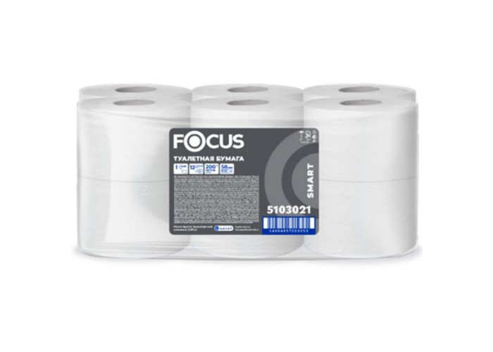 Туалетная бумага Фокус Смарт Джамбо однослойная в средних рулонах белая (100% первичная целлюлоза) с тиснением Scalette, длина рулона 200 метров. Диаметр рулона 164мм, диаметр втулки 58мм.