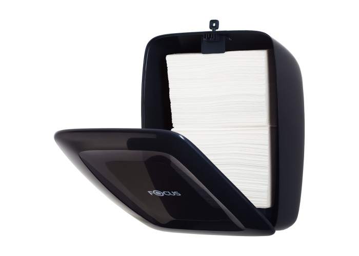 Универсальный настенный диспенсер Focus для листовых бумажных полотенец Z и V сложения с крепким ударопрочным пластиковым корпусом, арт 8076284. Похож по внешней конструкции на модели для рулонных полотенец, но в данном случае внутрь вставляется объёмная прямоугольная пачка листов бумаги, сложенных стопкой. Диспенсер позволяет реже менять полотенца на точке за счет их количества и сократить расход полотенец в местах со средней и высокой проходимостью за счет полистовой подачи. Полупрозрачная панель дает возможность контролировать остатки бумажной продукции в диспенсере. Изделие удобно и быстро монтируется на стену с помощью крепления шурупами. Прочный ABS пластик позволяет значительно продлить срок службы диспенсера.