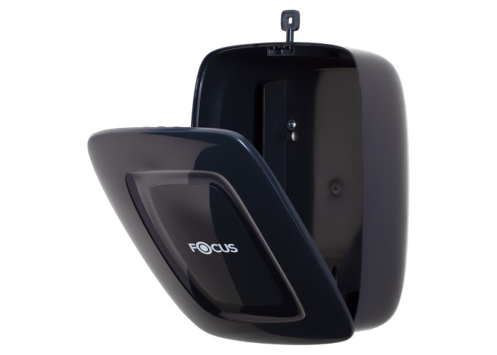 Диспенсер пластиковый черный Фокус для листовой туалетной бумаги V-сложения любой слойности. Удобно монтируется на стену болтами (в задней стенке имеется несколько крепких отверстий). Полупрозрачная панель позволяет отслеживать расход бумаги.