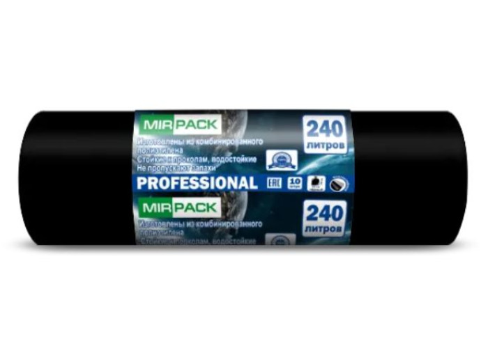 Мешки для мусора 240 литров Mirpack Professional из ПВД (комбинированный полиэтилен высокого давления) в экономичной намотке, плотность изделия - 35мкм, размер пакета - 93х130см, цвет - черный (не просвечивается, плотный). Стойкий к проколам, не пропускает неприятные запахи. Эластичный прочный материал, изготовлен по специальной технологии и выдерживает нагрузку до 30 кг.