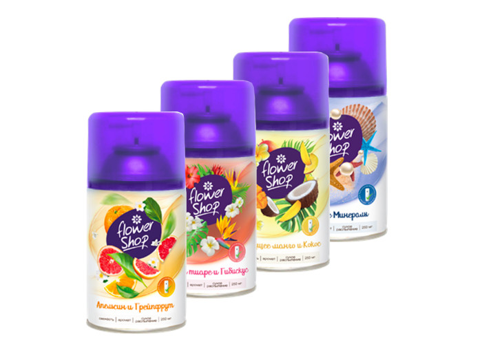 Сменные баллоны Flower Shop объёмом 250 мл подходят для любых автоматических устройств увлажнения и ароматизации воздуха. Сухое распыление не оставляет следов на кафеле, потолке и стенах, разводов на зеркалах, обоях или тканевых занавесках. Приятные свежие ароматы для создания атмосферы комфорта и уюта.