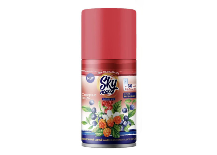 Освежитель воздуха "Северные ягоды" со сменным баллоном SKY MAX для автоматических диспенсеров, объём 250 мл. Подходят для большинства освежителей, в том числе для AIRWick и Glade. Сухое распыление. Легко устраняет неприятные запахи, наполняет помещение приятным легким свежим ароматом. До 60 дней свежести. Простые и понятные в использовании. Спокойный ягодный аромат подойдет для любых помещений: для спальни, ванной, гостиной, кухни.