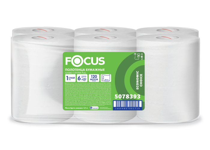 Бумажные полотенца FOCUS ECO Jumbo (фокус эко джамбо) из 100% целлюлозы, белые и приятные для рук, в рулонах подходят для установки во все стандартные диспенсеры с центральной подачей (есть втулка). Подходят для протирки столешниц и кухонных принадлежностей в процессе приготовления пищи, для прокладки овощей в холодильнике, для других задач на кухне (рулон очень устойчивый, его легко можно поставить на стол). Сделаны из первичной целлюлозы, мягкие, не рвутся, быстро не промокают. Есть качественная перфорация и тиснение.