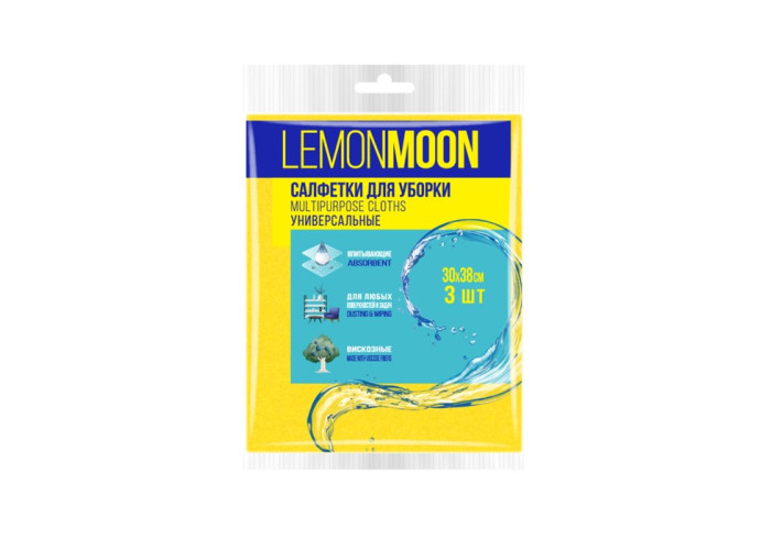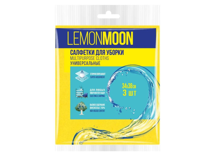 Салфетка универсальная Lemon Moon из вискозы (50%), размер 30х38см и 34х38см, плотность 80 г/м2, мягкая и приятная в использовании. Прекрасно подходит для сухой и влажной уборки на кухне, в ванной комнате, в жилых помещениях. Вискоза хорошо впитывает влагу и собирает грязь, подходит для любых поверхностей и задач. Волокна вискозы обладают абсорбирующими свойствами - хорошо собирают воду или другие пролитые жидкости.