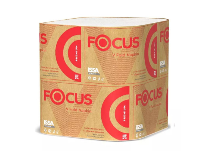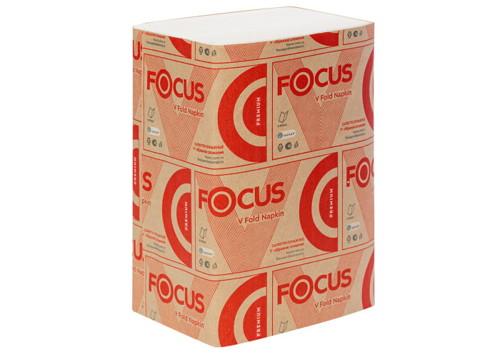 Салфетки бумажные FOCUS PREMIUM 2хслойные V-fold (сложение) прочные для диспенсеров. Изготовлены из 100% первичной натуральной целлюлозы, белые и мягкие, с тиснением, хорошо впитывают жидкости. Экономичны в использовании, если извлекаются из диспенсера. Подходят для сервировки стола.