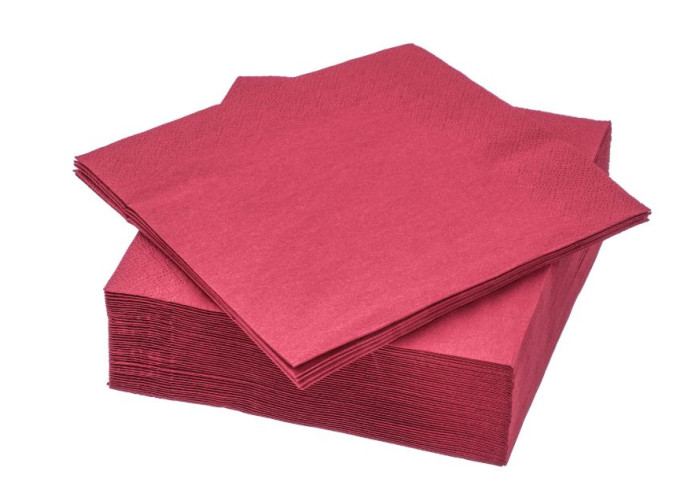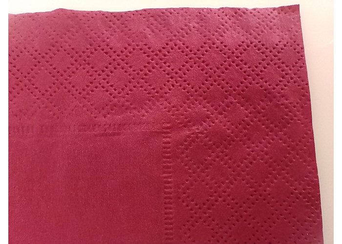 Салфетки бордо столовые, 2 слоя, размер 33х33 см, сложение 1/4 (классическое, квадратные), цвет - темно-бардовый. Подойдут для декорирования праздничного стола, прочно окрашенные, не разваливаются в руках. Материал - 100% первичная целлюлоза, хорошая плотность - 34гр/м2, 200 листов в пачке (9 пачек в коробе), тиснение "рамка"/"камушки" (классическое).
