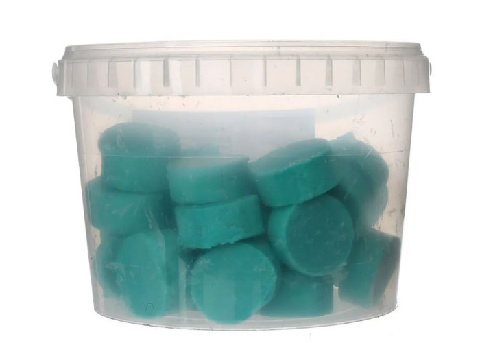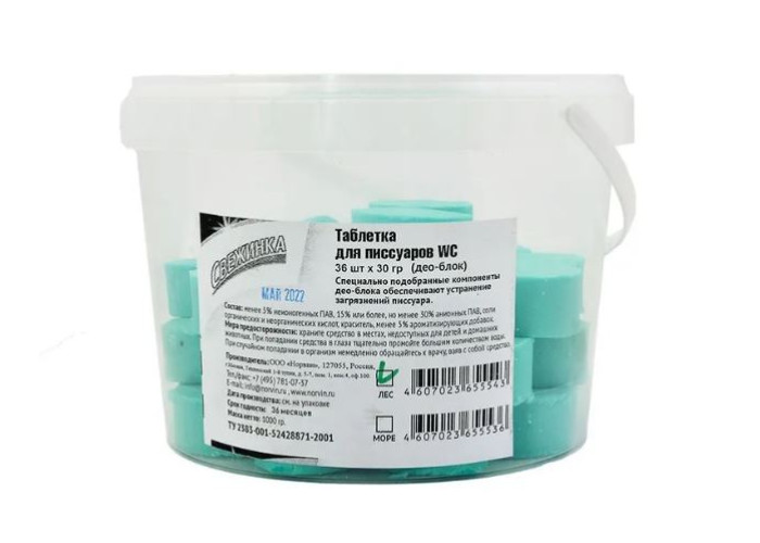 Средство чистящее для унитазов в местах общественного пользования - таблетки растворимые для писсуаров WC "Свежинка" голубого цвета с део-блоком, цвет "море", аромат "морская свежесть", 36 штук в пластиковом ведерке с ручкой, масса - 30гр/шт. Эффективны в холодной воде, при растворении создают активную пену, дезинфицируют сантехнику, при многократном использовании постепенно растворяют загрязнения на стенках и под ободком унитаза, нейтрализуют неприятные запахи. Можно чистить ванны и желоба.