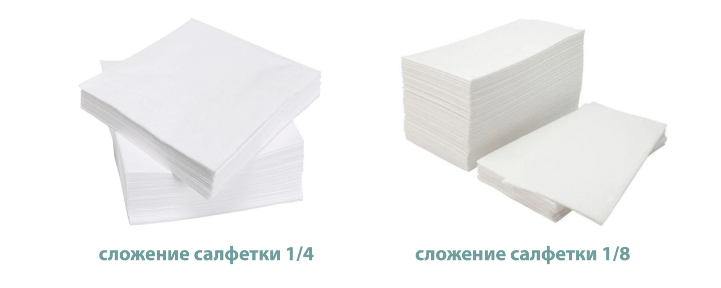 Салфетки бывают разных размеров, но самые ходовые на сегодняшний день - 24х24см и 33х33см, наиболее популярные варианты сложения - 1/4 и 1/8.